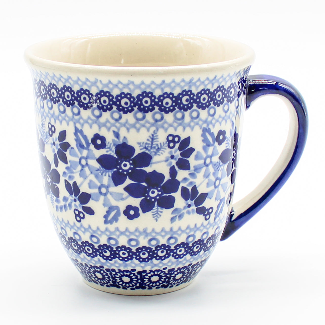 Polish Stoneware Lg Bistro Cup 16 oz (K-106) Great for coffee, tea, hot chocolate, and soup Popular seller and perfect cup to go with the round place settings This mug is perfect for everyday at home and the office! Dimensions Volume 16 oz Diameter 4 inches Hight 4.5 inches Features Dishwasher safe Oven safe Microwave safe Freezer safeDimensions (in inches):