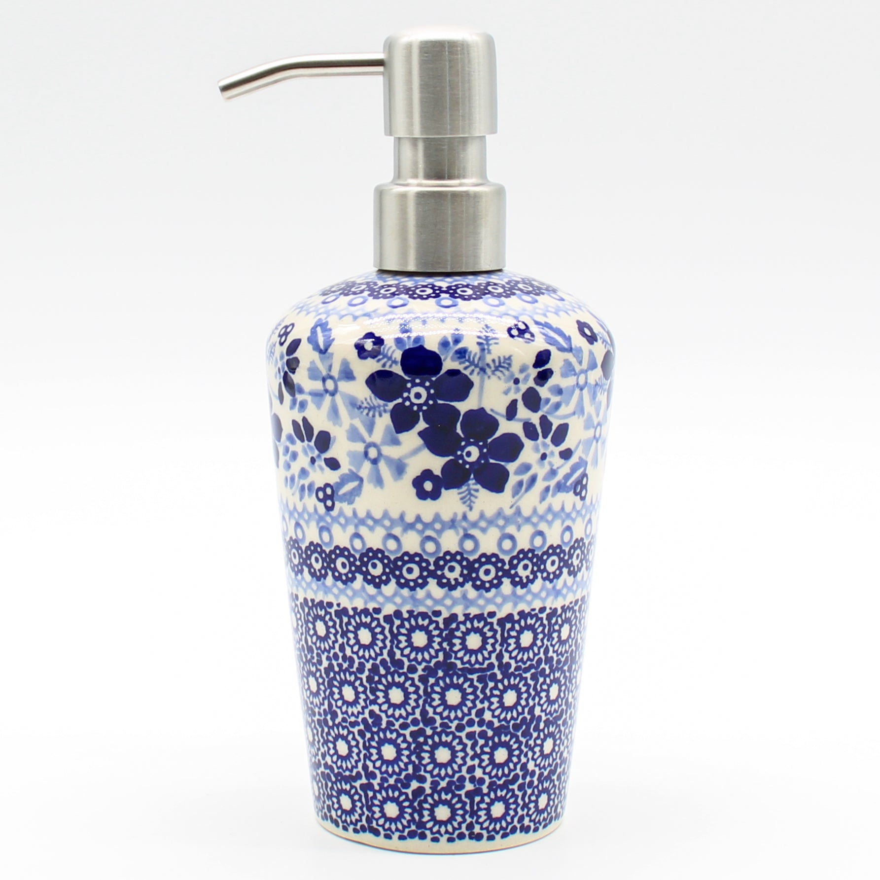 Polish Pottery Soap Dispenser (B-009) Beautiful in any bathroom, or kitchen Dimensions Diameter 3 inches Hight 7 inches Features Dishwasher safe Oven safe Microwave safe Freezer safeDimensions (in inches):