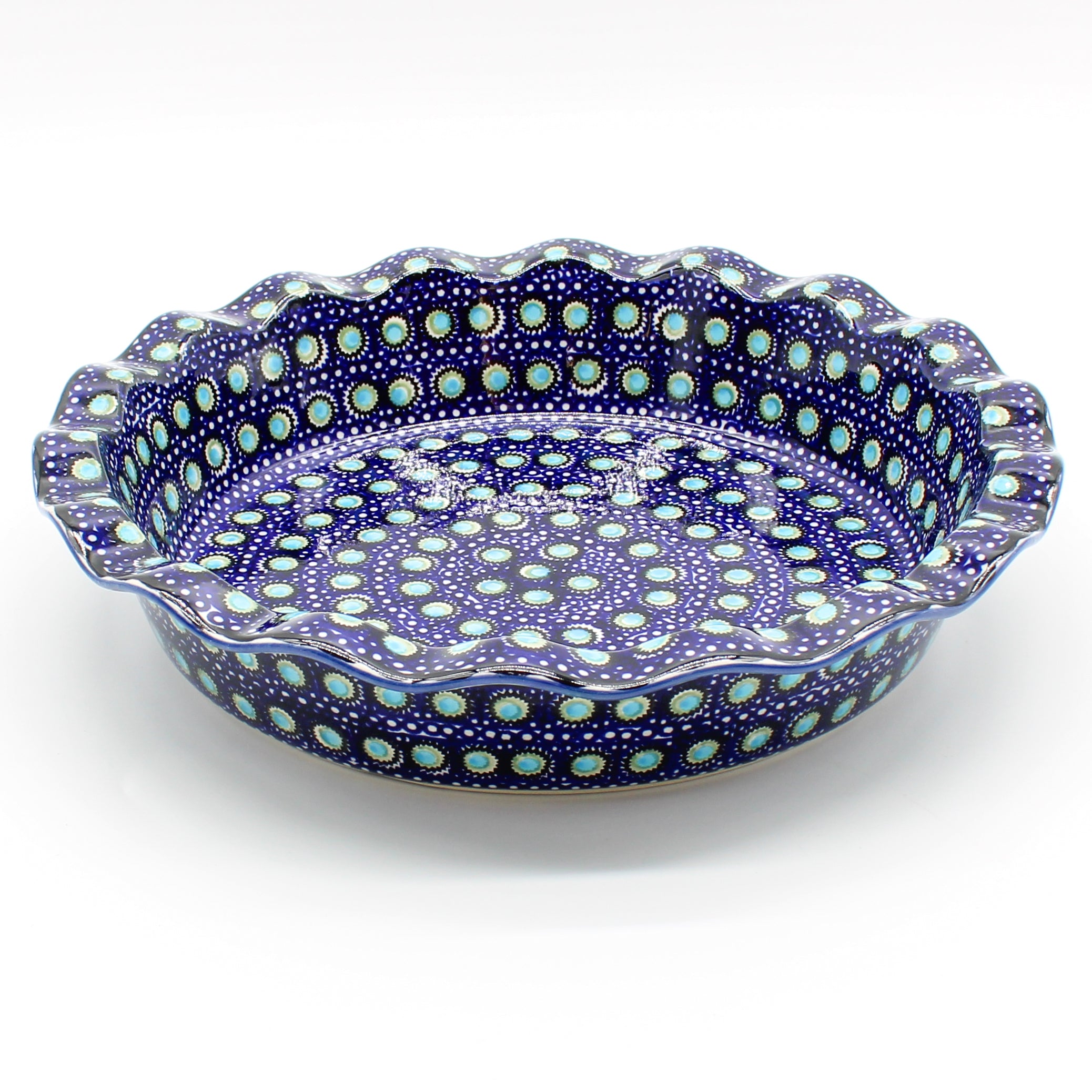Beautiful round baker with scalloped edge for pies, dips, or serving.