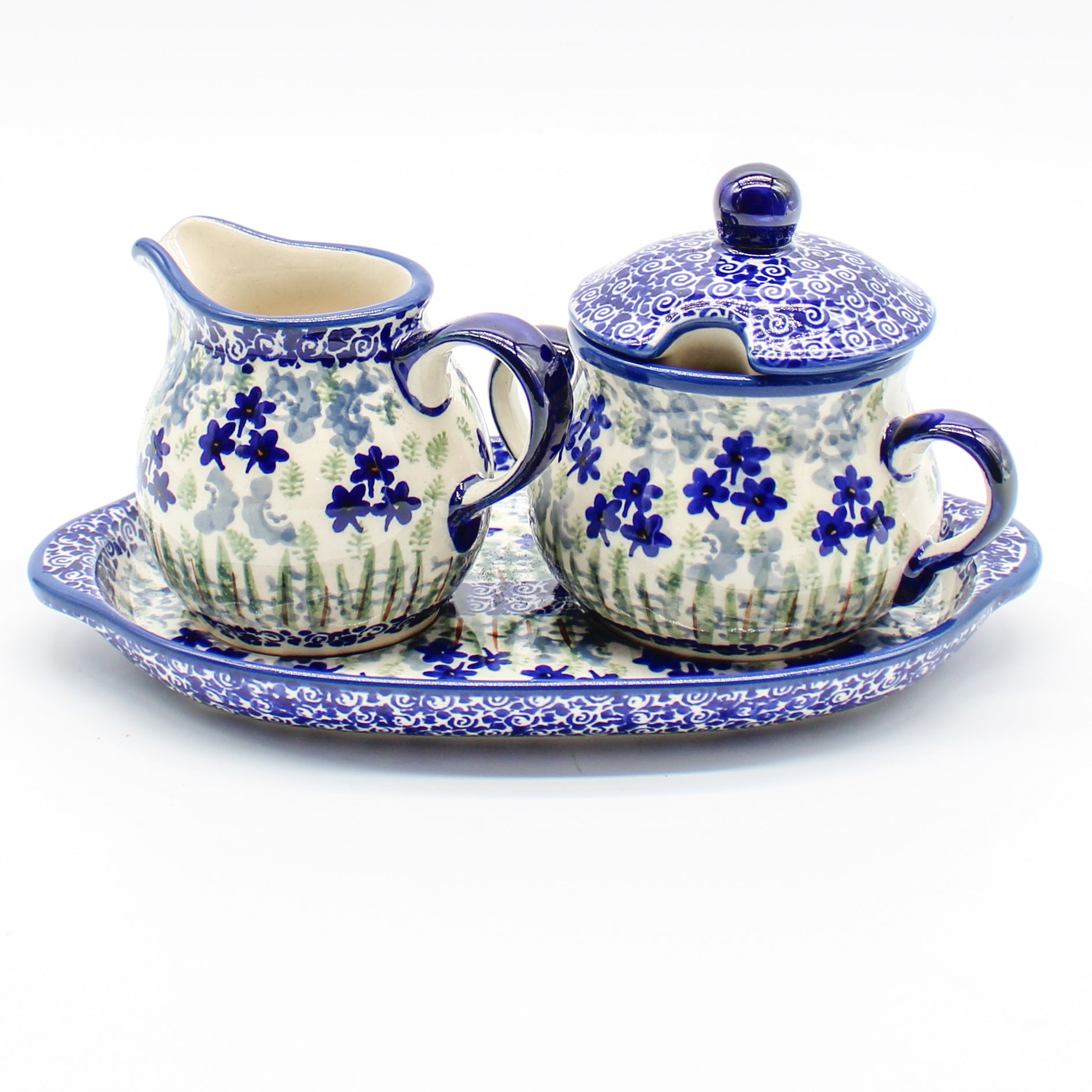 Polish Pottery Creamer & Sugar Set w/Tray (K-091) Beautiful addition to any table Dimensions Volume 6 oz (creamer) Volume 8 oz (sugar bowl) Features Dishwasher safe Oven safe Microwave safe Freezer safeDimensions (in inches):
