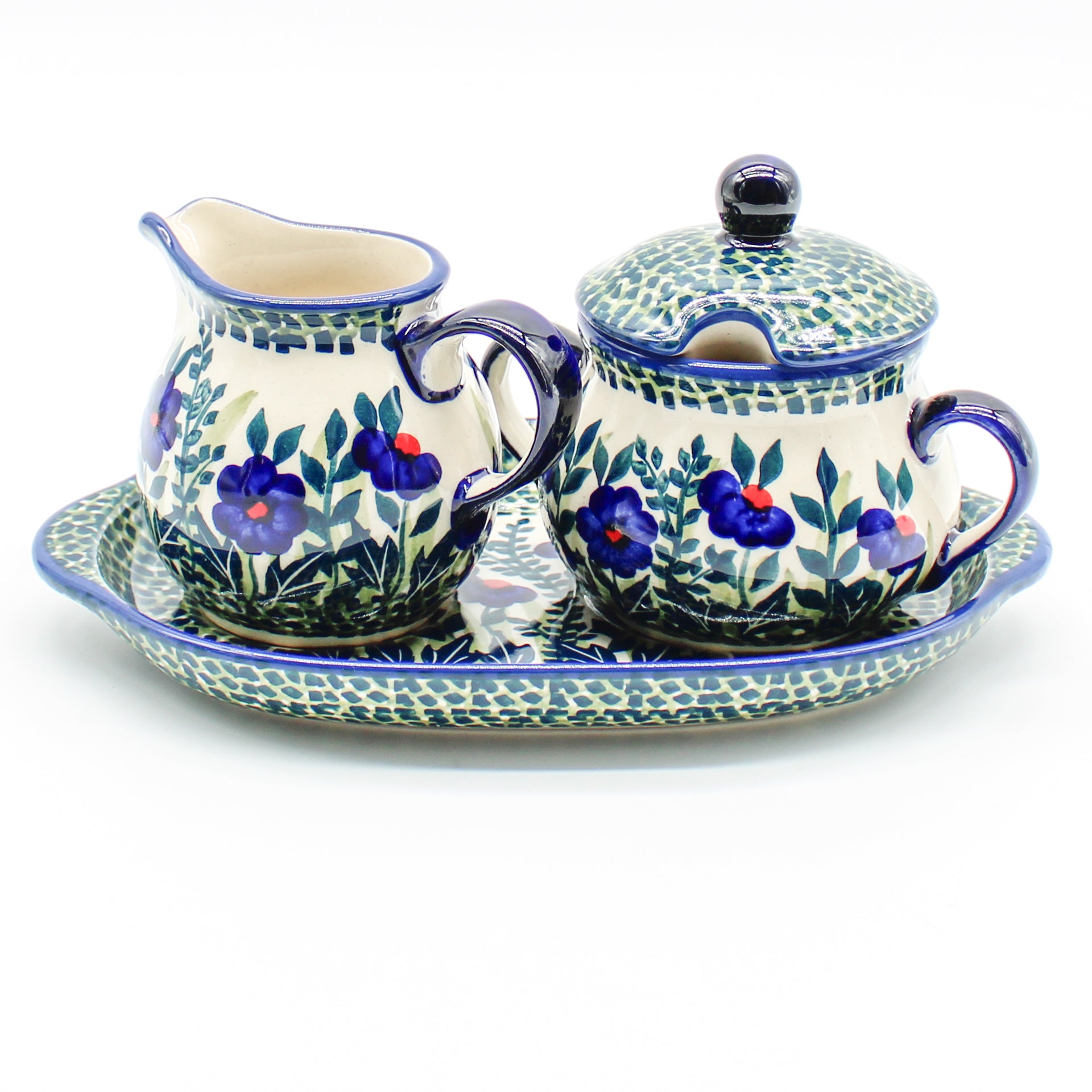 Polish Pottery Creamer & Sugar Set w/Tray (K-091) Beautiful addition to any table Dimensions Volume 6 oz (creamer) Volume 8 oz (sugar bowl) Features Dishwasher safe Oven safe Microwave safe Freezer safeDimensions (in inches):