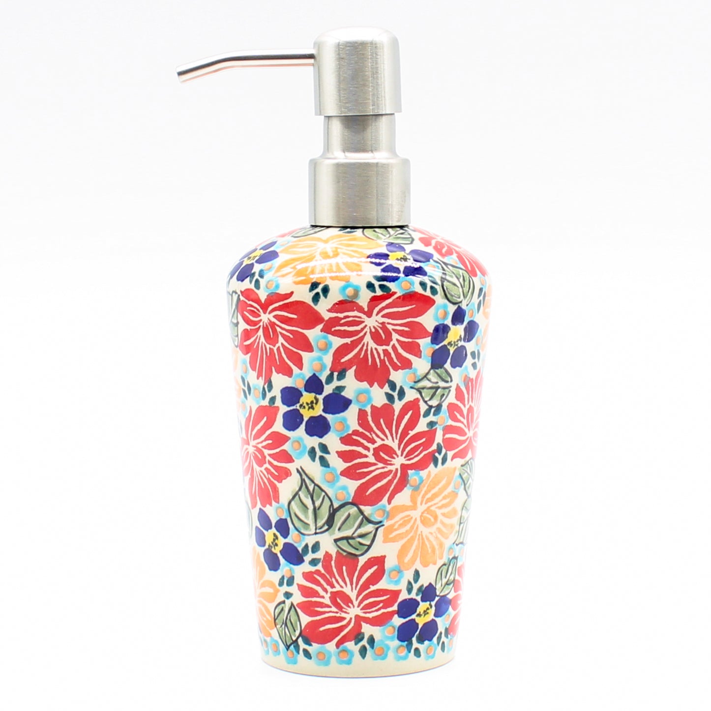 Polish Pottery Soap Dispenser (B-009) Beautiful in any bathroom, or kitchen Dimensions Diameter 3 inches Hight 7 inches Features Dishwasher safe Oven safe Microwave safe Freezer safeDimensions (in inches):